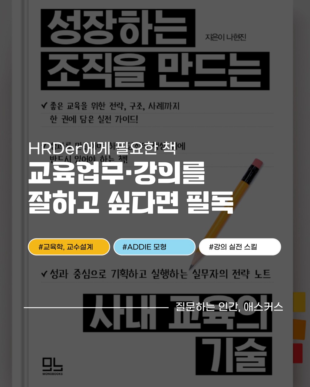 사내 교육은 일반 강의와 다르다. 구성원은 자발적인 학습자가 아니며, 강사는 낯선 외부 전문가가 아니라 동료이자 내부 변화의 촉진자다. 단순히 강의를 잘한다고 좋은 교육이 되지 않으며, 실무와 연결되지 않는 교육은 곧 잊혀버리고 만다. 이 책은 바로 그 지점에서 출발한다. 사내 교육이 조직의 전략과 맞닿고, 실질적인 행동 변화로 이어지도록 설계하는 기술을 알려준다.